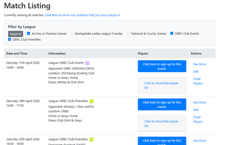 For the 2026 season, all of our Club Friendlies, Club Events, Basingstoke Ladies League and National & County Games will be managed within BCS. You must therefore use the BCS system to sign up or be selected for any of these types of games.